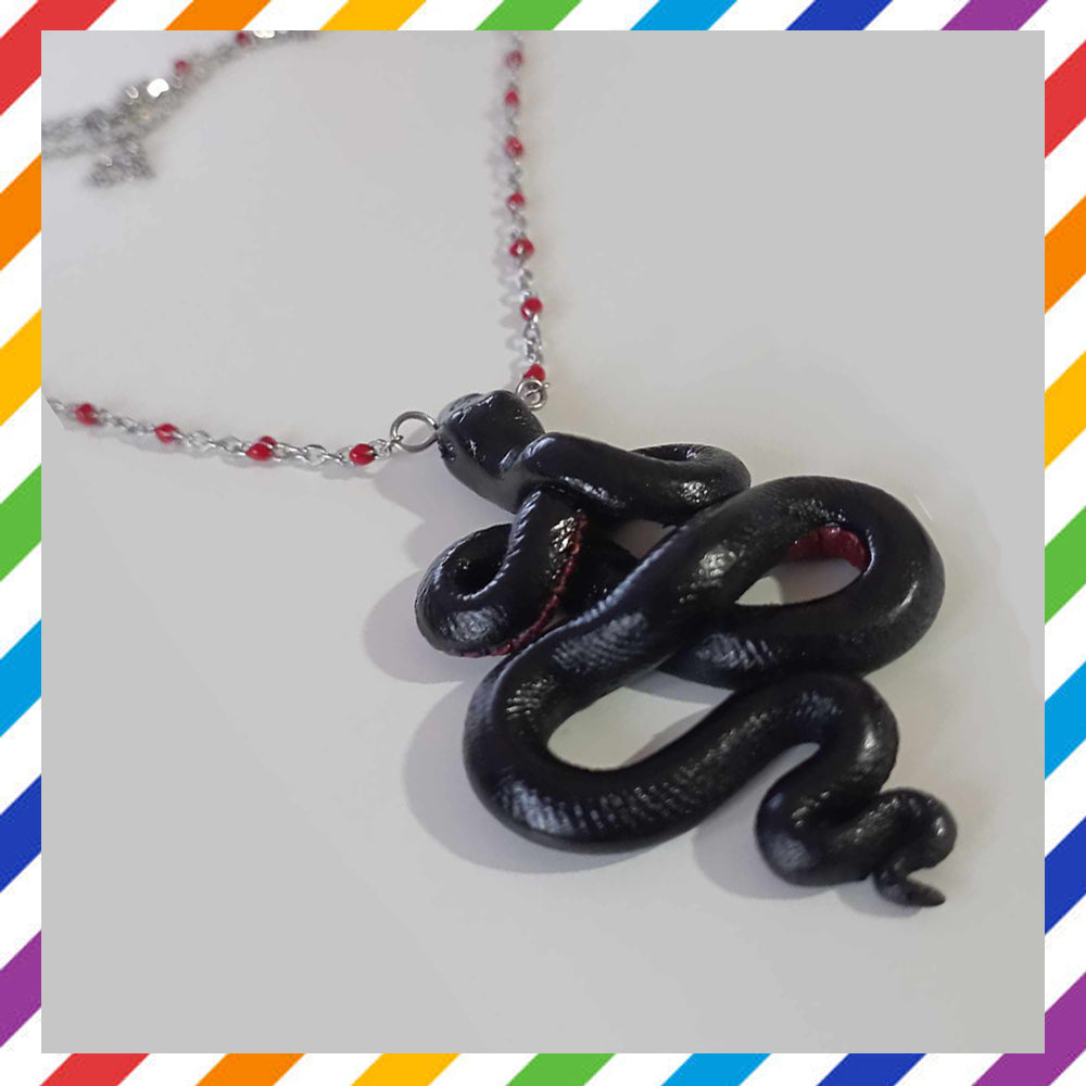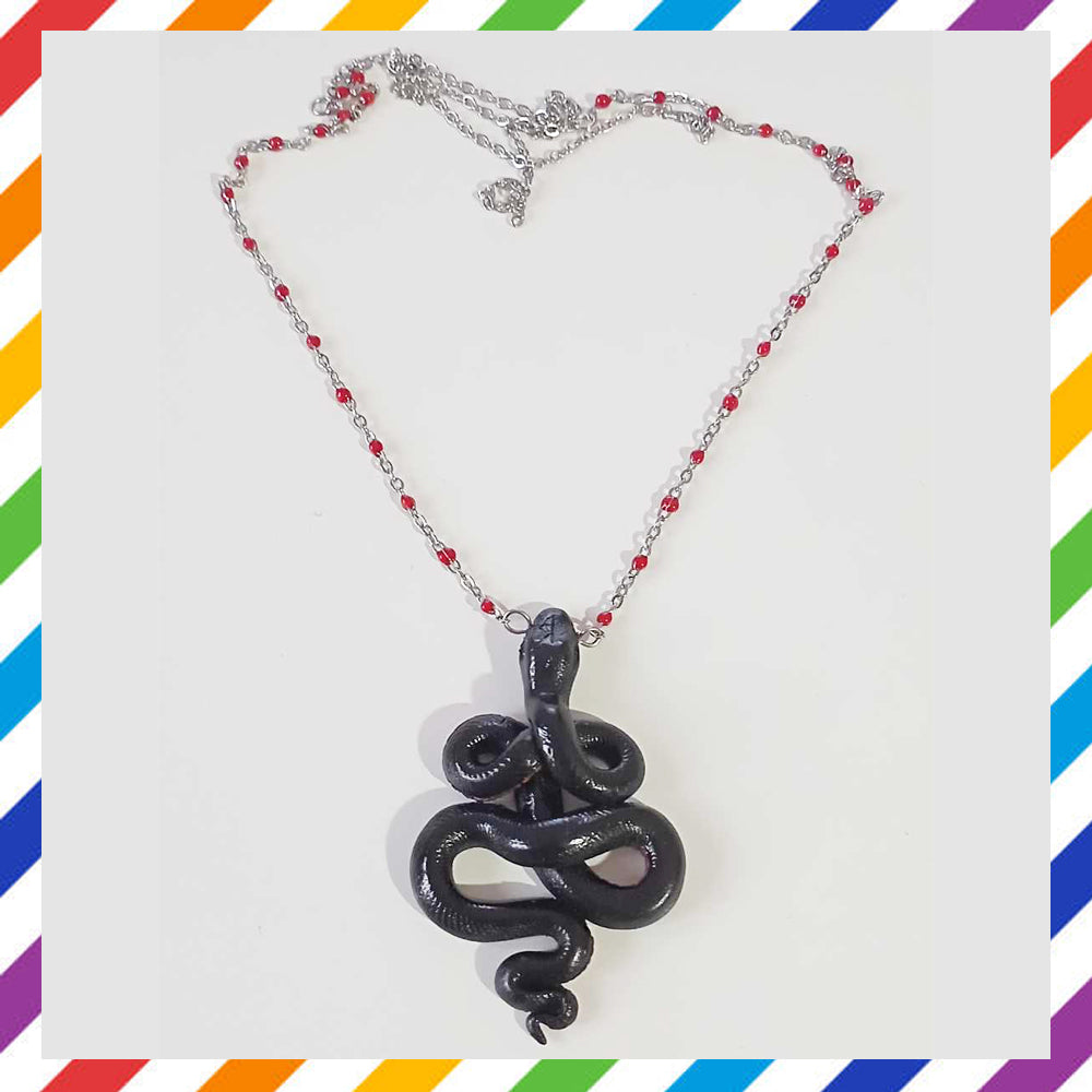 Made and hand painted by Nele, each of these necklaces is a unique piece. Steel chain with resin pearls. Epoxy resin pendant. Size of the snake approximately 6 cm.