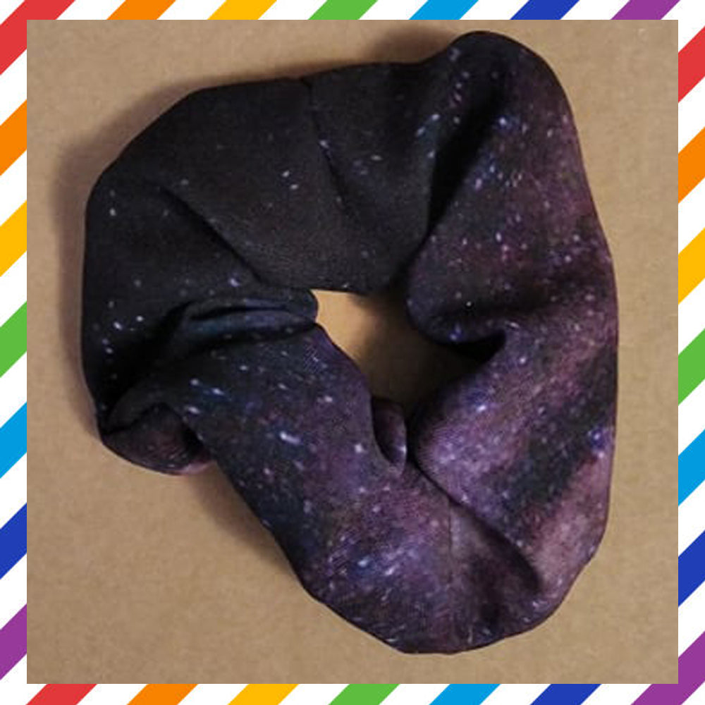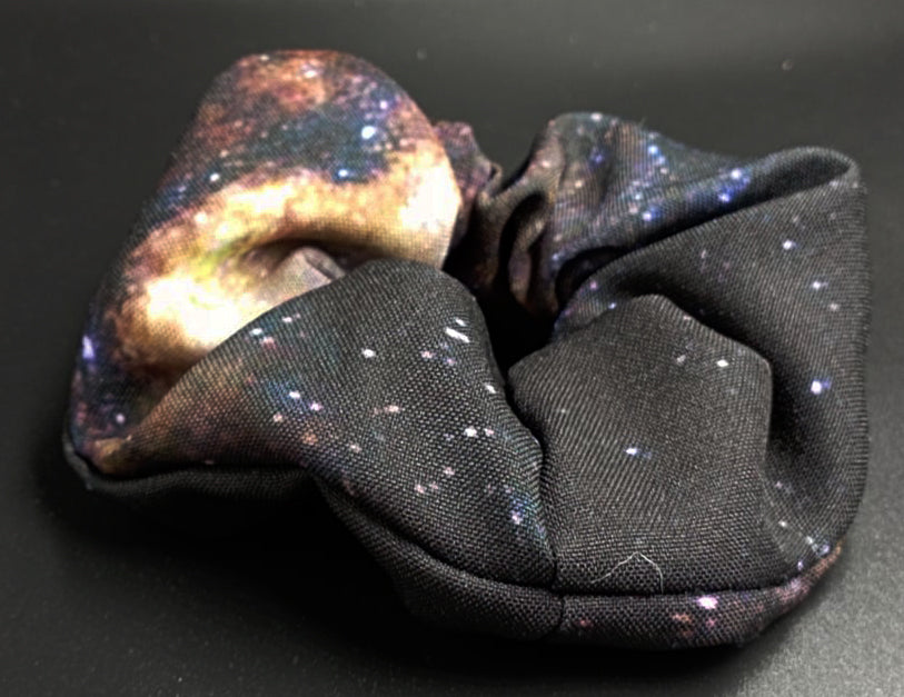 Scrunchy (hair ribbon) with a print of a white nebula on a dark background.