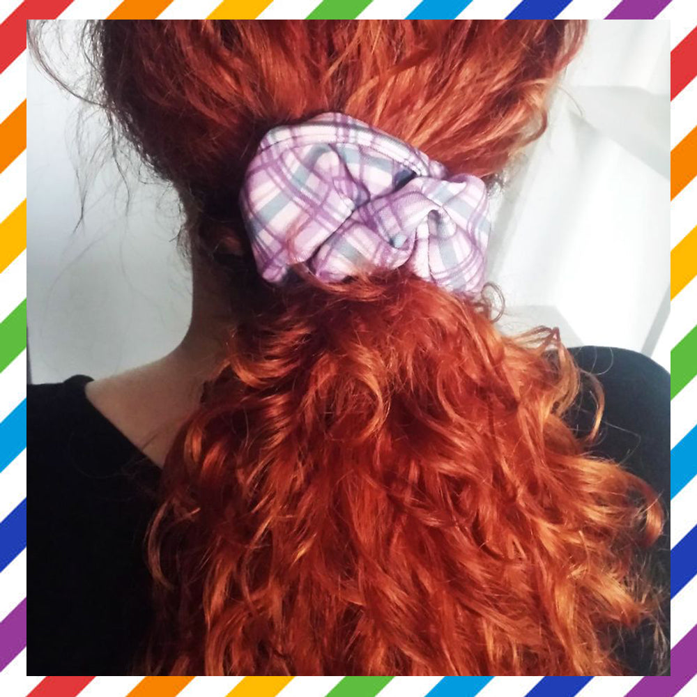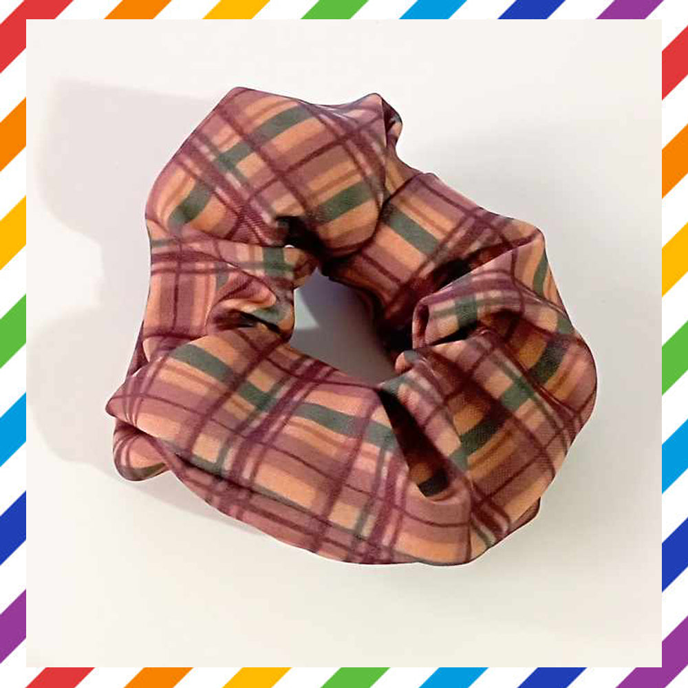 Hair scrunchy, handcrafted with digitally printed fabric inspired by the Aziraphale Tartan.