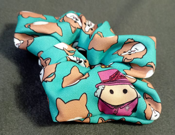 Scrunchy (elastico per capelli) con il design ispirato a Elisabetta II e i suoi Corgi nella versione Potato ideata da Zefkiel Noir.