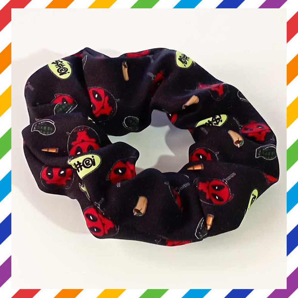 Scrunchy (elastico per capelli) con il design ispirato a Deadpool nella versione Potato ideata da Zefkiel Noir.