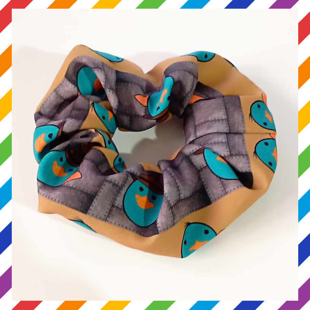 Scrunchy (elastico per capelli) con il design ispirato a Perry l'ornitorinco nella versione Potato ideata da Zefkiel Noir.